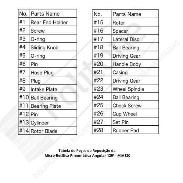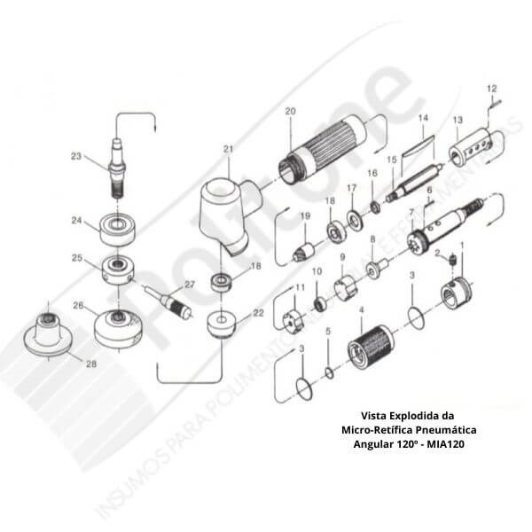 Peça Reposição Micro Retífica Pneumática Angular 120º MIA120, podem ser visualizada na imagem abaixo chamado vista explodida, também conhecida como perspectiva explodida, é um tipo de diagrama, imagem ou desenho técnico que mostra a relação espacial entre as peças de um conjunto ou equipamento. Nessa representação, as peças são desenhadas como se estivessem “explodindo” para fora de um ponto central, mantendo a proporção e a distância entre si na posição original de montagem.