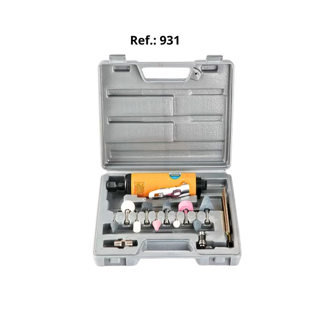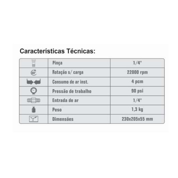 Kit Retífica pneumática de 1/4” para uso profissional e industrial em linha de montagem, marcenarias, serralherias, nos acabamentos de superfícies soldadas, alargamento de furos acabamento em moldes, matrizes e muito mais! Desenvolvida com rotor de 4 palhetas, rolamentos industriais, desenho compacto e com cabo ergonômico a retífica realiza trabalhos com menor vibração e maior precisão na hora de fazer o acabamento no seu trabalho. – Acionamento rápido e prático – Saída de ar na parte traseira da máquina – Ergonômica – Compacta – Leve.